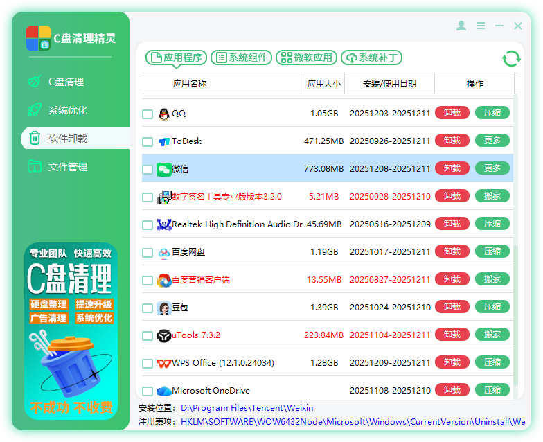快速、安全地卸载不需要的软件,并可以自由选择将软件从原位置迁移到其他存储空间。简化用户对软件的维护和管理。